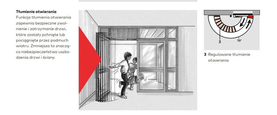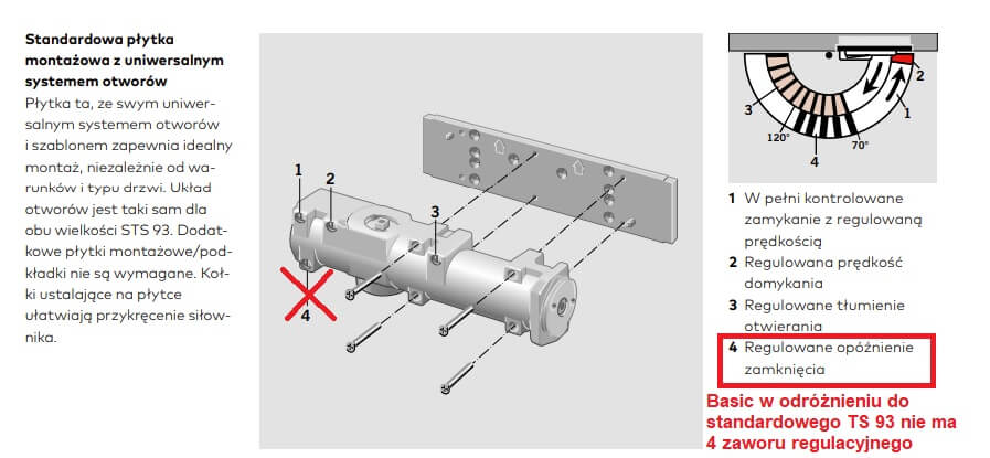 Jedną z najważniejszych zalet samozamykacza DORMA TS 93 B BASIC jest regulowana siła zamykania, która może być dostosowana poprzez zmianę naciągu sprężyny w zakresie PN-EN 2-5 do szerokości skrzydła 1250mm. Dodatkowo, regulowana szybkość zamykania w zakresie 180° – 70° i 70° – 0° , regulowane dobicie w zakresie 7° – 0° oraz regulowane tłumienie otwierania (BC - Back Check) umożliwiają precyzyjne dostosowanie samozamykacza do indywidualnych potrzeb. Samozamykacz DORMA TS 93 B BASIC jest również wyposażony w opcję blokady położenia otwartego oraz ogranicznika otwarcia w szynie ślizgowej, co zapewnia dodatkowe bezpieczeństwo użytkowania. Kompletny pakiet zawiera samozamykacz, płytę montażową oraz szynę ślizgową, co ułatwia zamówienia oraz instalację. Samozamykacz DORMA TS 93 B BASIC spełnia normę PN-EN 1154 oraz wymogi normy DIN SPEC 1104, co potwierdza jego wysoką jakość i niezawodność.
