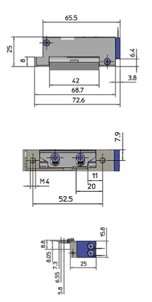 Obudowa o szerokości zaledwie 15,8 mm oraz wymiary 72,6 × 15,8 × 25 mm sprawiają, że elektrozaczep doskonale nadaje się do montażu w wąskich profilach aluminiowych i metalowych futrynach. Symetryczna konstrukcja umożliwia montaż w drzwiach lewych i prawych.
