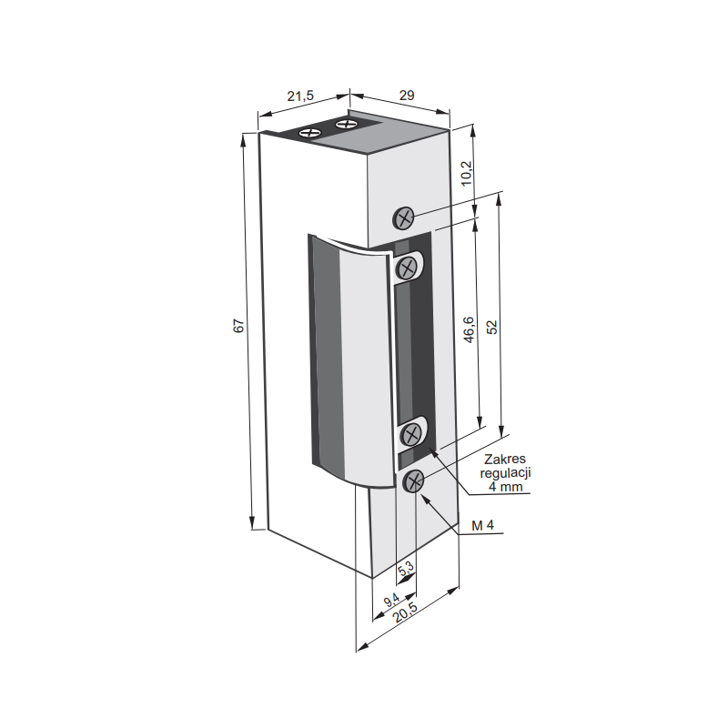 JIS 1711 Elektrozaczep rewersyjny 12V DC Elektrozaczep rewersyjny (NO - bez prądu otwarty) pozostaje zablokowany przy zasilaniu prądem stałym DC. Elektrozaczep dedykowany jest do zastosowania zarówno w prawych, jak i lewych skrzydłach drzwi z kontrolą dostępu. Regulacja języka elektrozaczepu w zakresie 4 mm. Rozstaw śrub montażowych 52 mm.