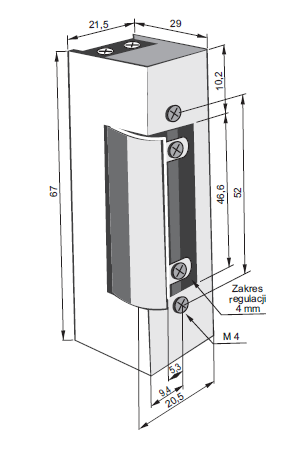 Elektrozaczep ma budowę symetryczną, pasuje więc do drzwi lewych i prawych. Regulacja wysunięcia języka w zakresie 4 mm.