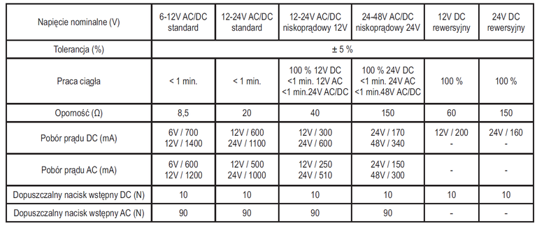 - Napięcie zadziałania: AC: 12-24V (+/-5%); DC: 12-24V (+/-5%)