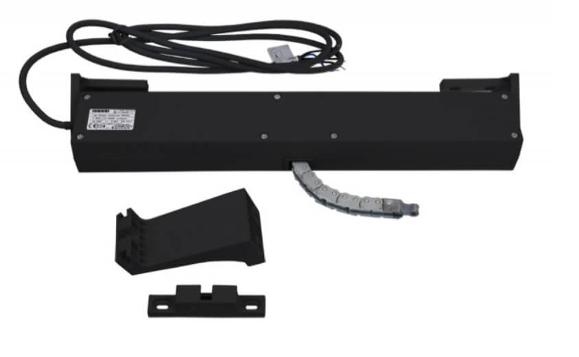 Zawartość zestawu: Siłownik łańcuchowy GEZE ECchain (czarny), komplet konsol montażowych, instrukcja obsługi oraz schemat połączeń.
