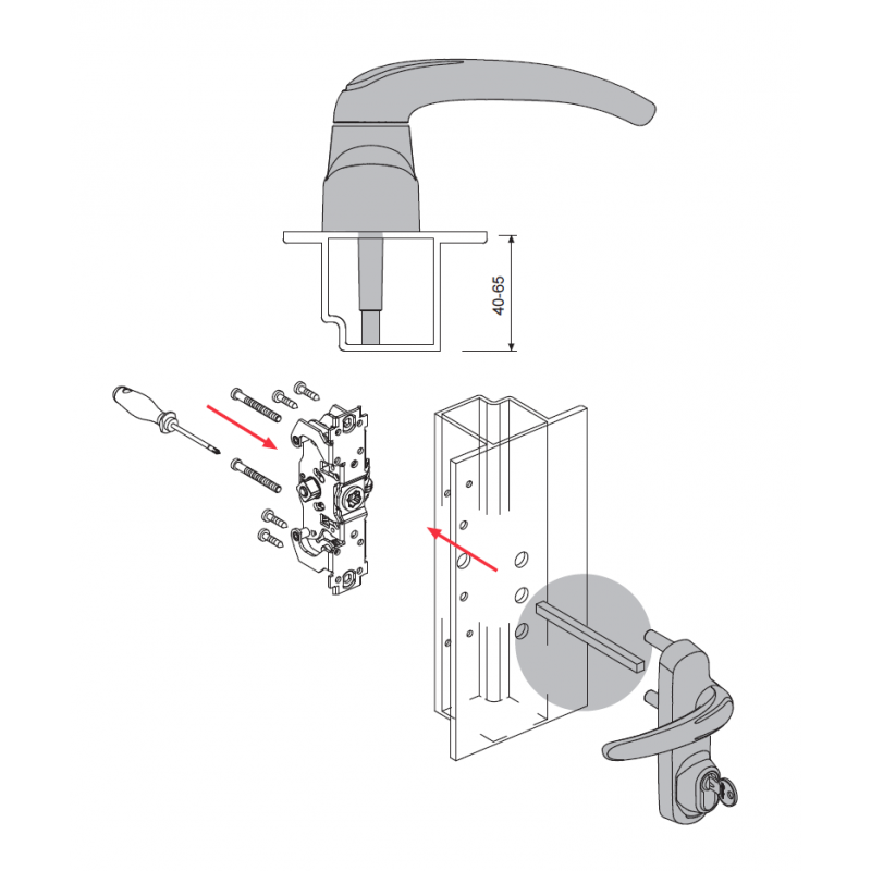 - Wymiar A – zmierz odległość od osi zamka (czyli od środka śruby mocującej) do krawędzi drzwi i dodaj wymiar grubości stosowanego szyldu.