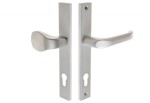 Klamka drzwiowa z pochwytem wykonana ze znalu - stopu cynku i aluminium, stosowana w drzwiach aluminiowych, PVC i wszędzie tam, gdzie z przyczyn kontrukcyjnych wymagany jest wąski szyld klamki (32 mm). Przeznaczona do drzwi o grubości maksymalnej 80 mm.
