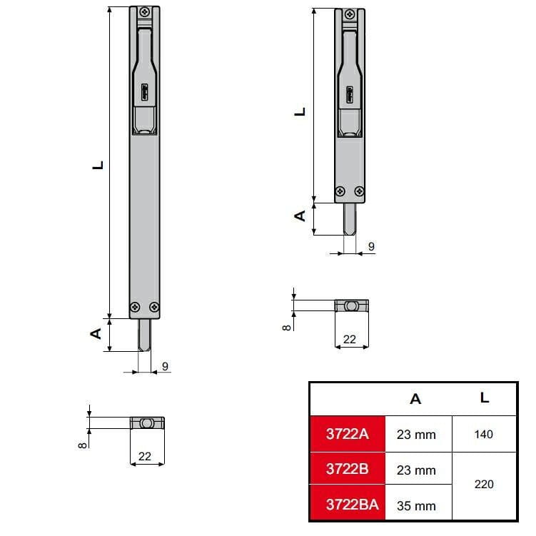 | Model | Wymiar A (Długość korpusu) | Wymiar B (Skok rygla) |
