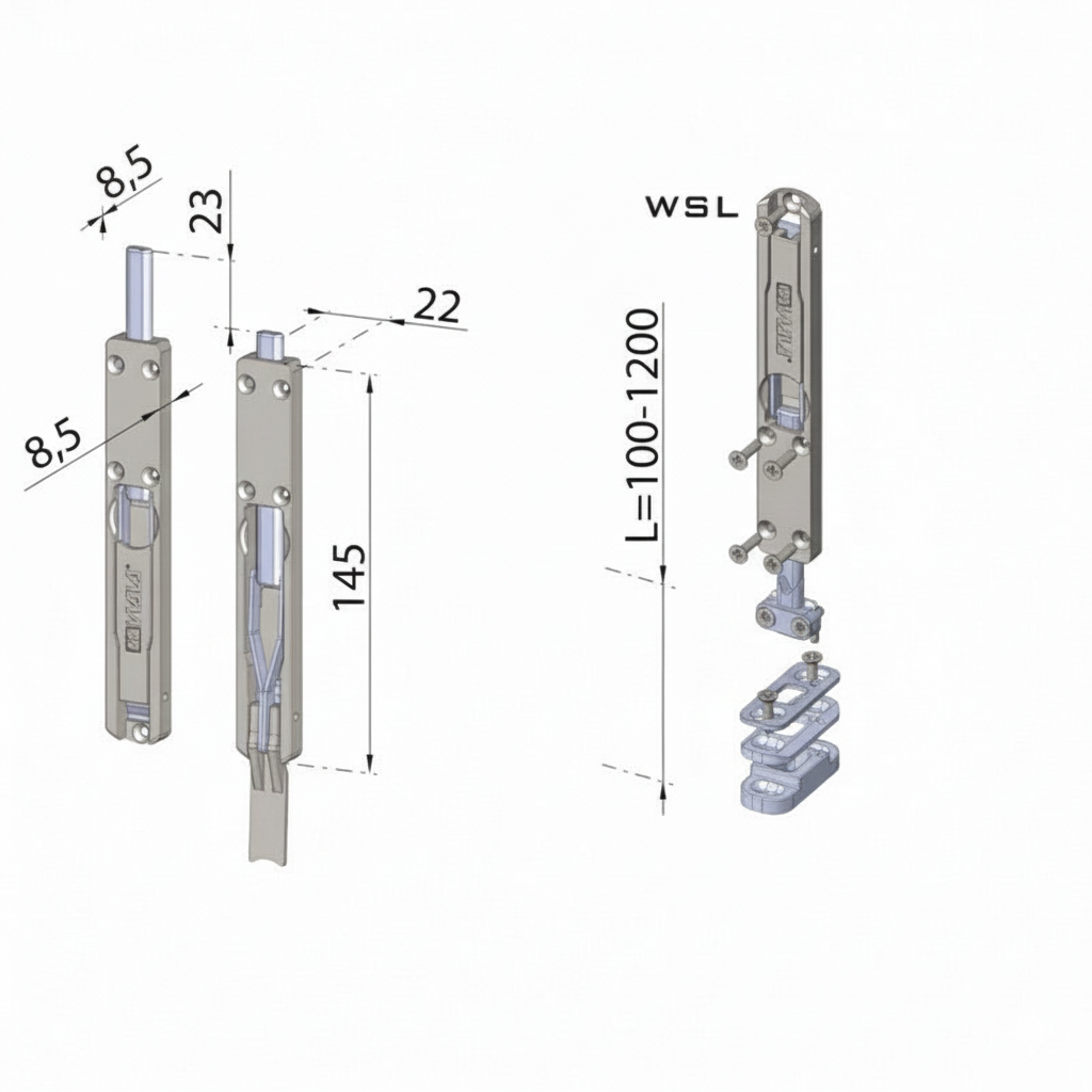 - Kompaktowy wymiar: Model WSN posiada skrócony korpus (145 mm), co pozwala na montaż na profilach o mniejszej wysokości lub w nietypowych konfiguracjach drzwiowych.