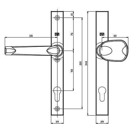 Uwaga: Wymiar "L=92" oznacza odległość od osi klamki do osi otworu na klucz/wkładkę.