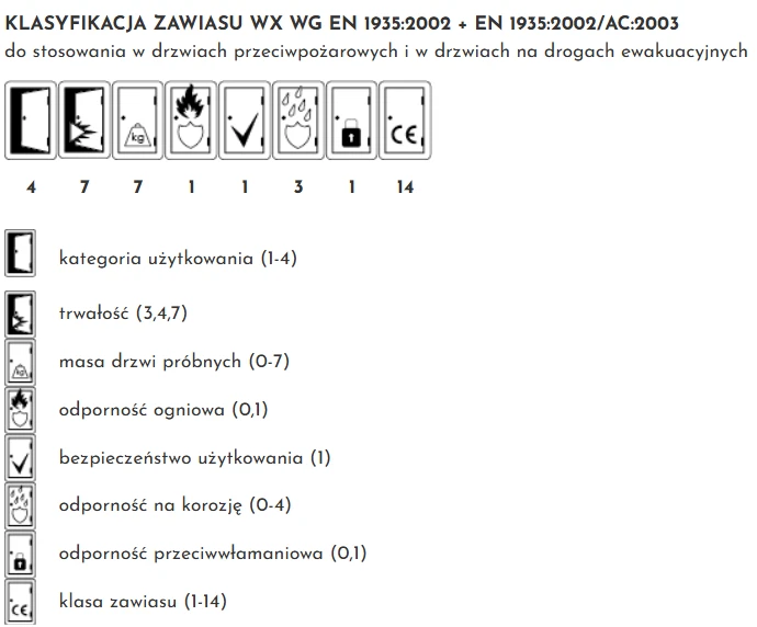4 Kategoria użytkowania: Klasa 4 z 4 (Bardzo ciężkie) 7 Trwałość: Klasa 7 z 7 (200 000 cykli) 7 Masa drzwi próbnych: Klasa 7 z 7 (do 160kg) 1 Odporność ogniowa: Klasa 1 z 1 (Drzwi ppoż.) 1 Bezpieczeństwo: Klasa 1 z 1 3 Odporność na korozję: Klasa 3 z 4 (Wysoka) 1 Zabezpieczenie antywłamaniowe: Klasa 1 z 1 14 Klasa zawiasu: Klasa 14 z 14 (Najwyższa)