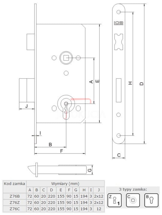 Zamek wpuszczany LOB Z76 72/60 ZAPADKOWO-ZASUWKOWY