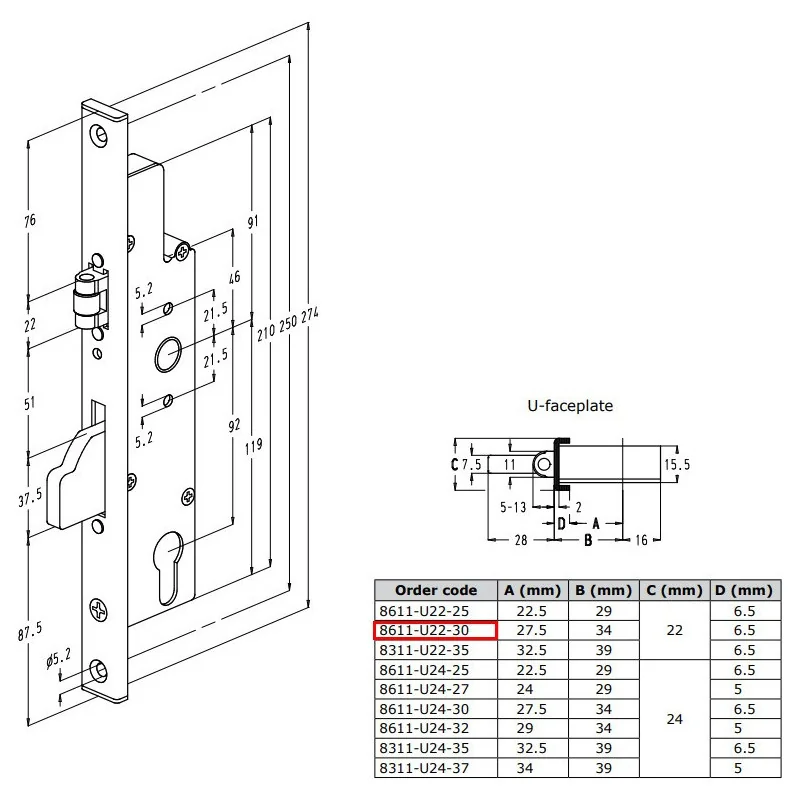 Zamek wpuszczany SOBINCO 8611-U22-30